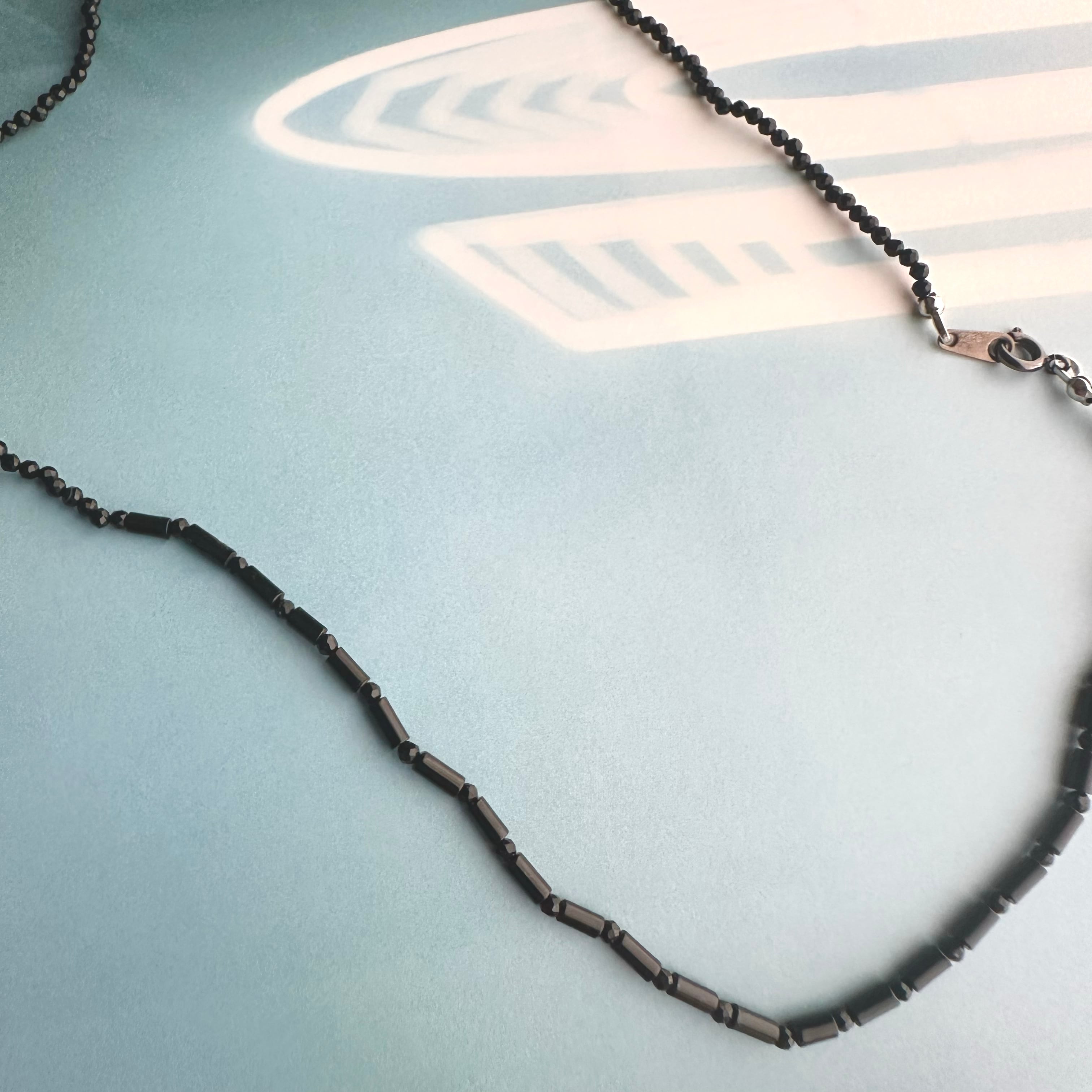 ネックレスにはオニキスの長いものとカットされてきらりと光る粒をアシンメトリーに組み合わせています。